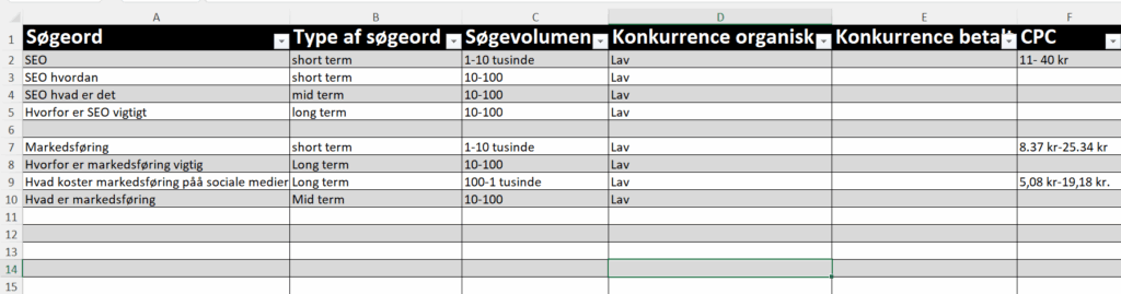 Vi indsamler søgeord med Answer The Public og Google Autosuggest for at få både bruger-drevet spørgsmål og præcise søgetermer, og organiserer dem i et Excel-ark med kolonner for type (short/mid/long), intention, volumen, konkurrence og CPC. Det giver os et datadrevet overblik, så vi hurtigt kan prioritere de mest værdifulde termer, skabe målrettet indhold og dokumentere vores SEO-strategi effektivt.